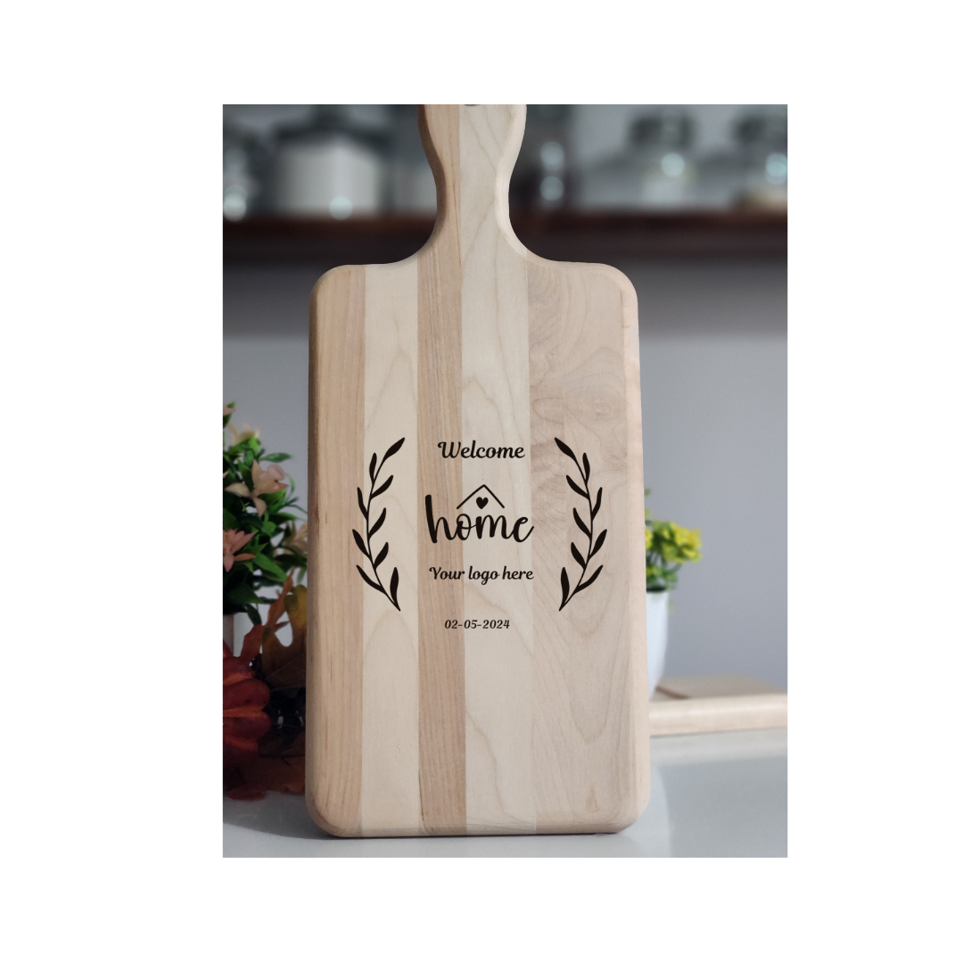 Personalized paddle cutting board, crafted from premium Canadian maple hardwood.